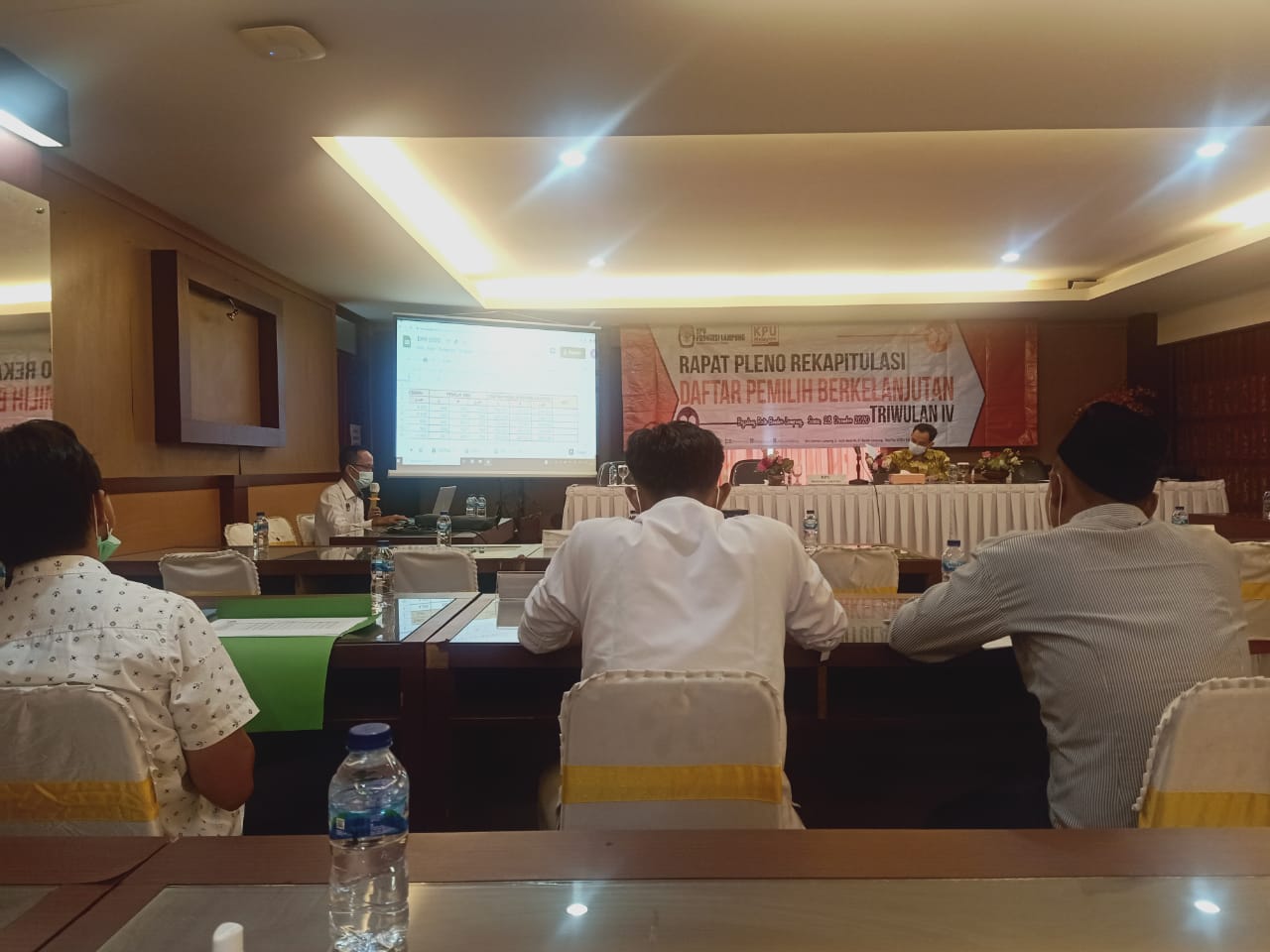 Rapat pleno rekapitulasi daftar pemilih berkelanjutan tahun 2020 di pimpin oleh Ketua KPU Provinsi Lampung yang di ikuti oleh ketua, anggota KPU yang membidangi divisi data dan admin/operator dari tujuh KPU Kabupaten/kota yang tidak melaksanakan pemilihan serentak pada tahun 2020.