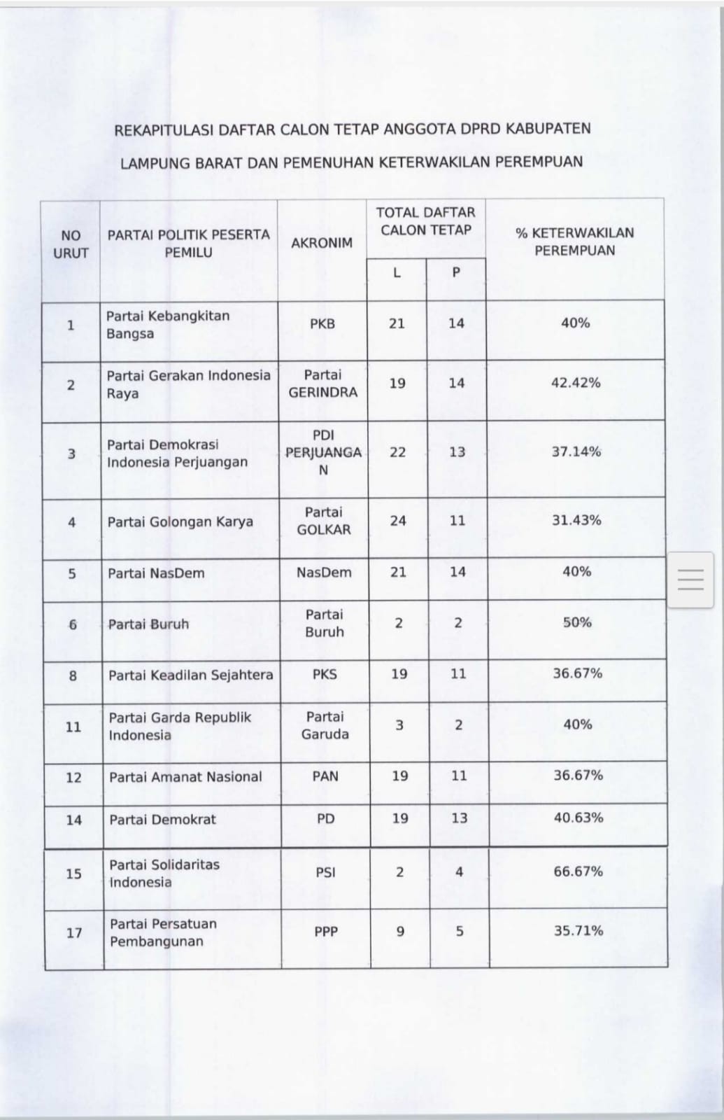 PENGUMUMAN DAFTAR CALON TETAP ( DCT ) ANGGOTA DPRD KABUPATEN LAMPUNG BARAT DALAM PEMILIHAN UMUM TAHUN 2024 DAN PERSENTASE KETERWAKILAN PEREMPUAN DALAM DAFTAR CALON TETAP