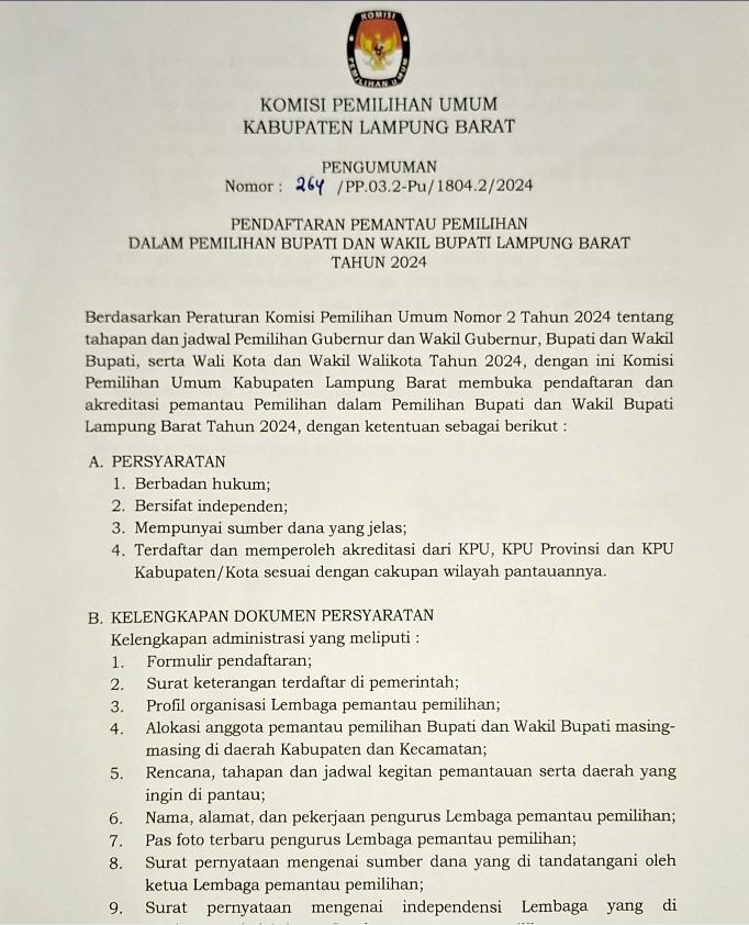 Berikut link Pengumuman Pendaftaran Pemantau Pemilihan dalam Pemilihan Bupati dan Wakil Bupati Lampung Barat Tahun 2024