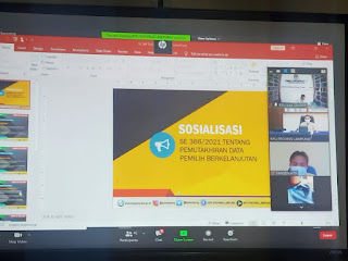 Komisi Pemilihan Umum Lampung Barat, rabu 28 April 2021 pukul 10.00 WIB bertempat diruang rapat, ketua Divisi Data Ahmad Soleh bersama team mengikuti Sosialisasi Surat Edaran KPU RI Nomor : 366/PL.02-SD/01/KPU/IV/2021 tanggal 21 April 2021 tentang perubahan Surat Ketua KPU RI Nomor : 132/PL.02-SD/01/KPU/2021 tentang Pemuktahiran Data Pemilih Berkelanjutan Tahun 2021 yang disampaikan oleh KPU Provinsi Lampung via daring bersama 15 KPU Kabupaten/Kota Provinsi Lampung.