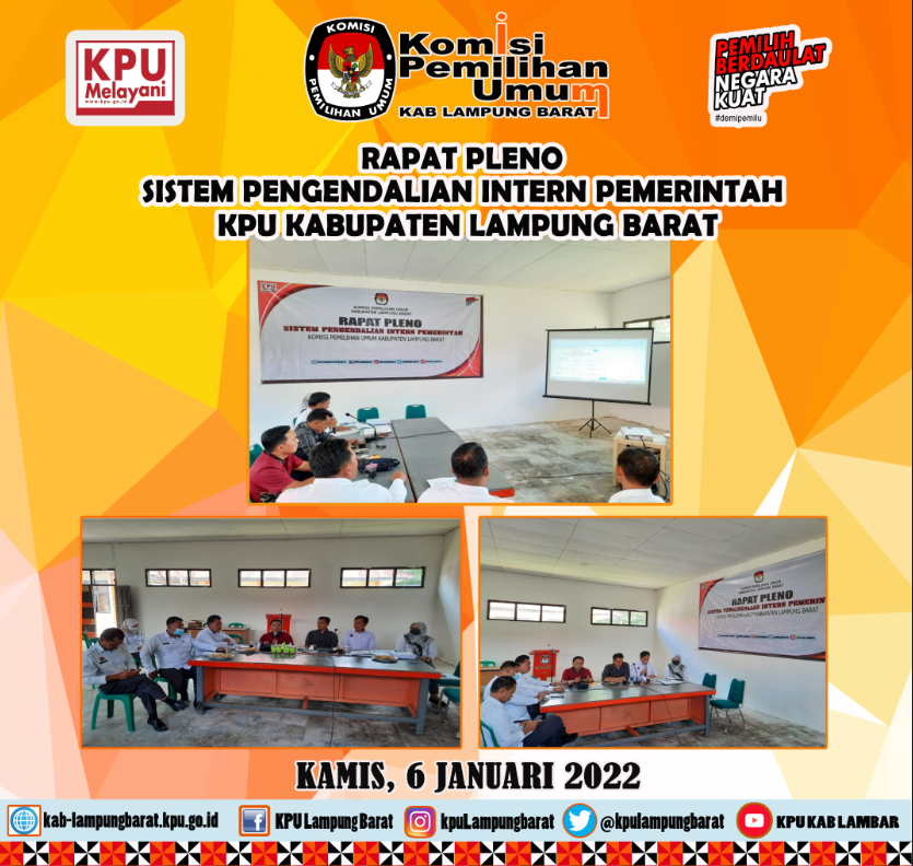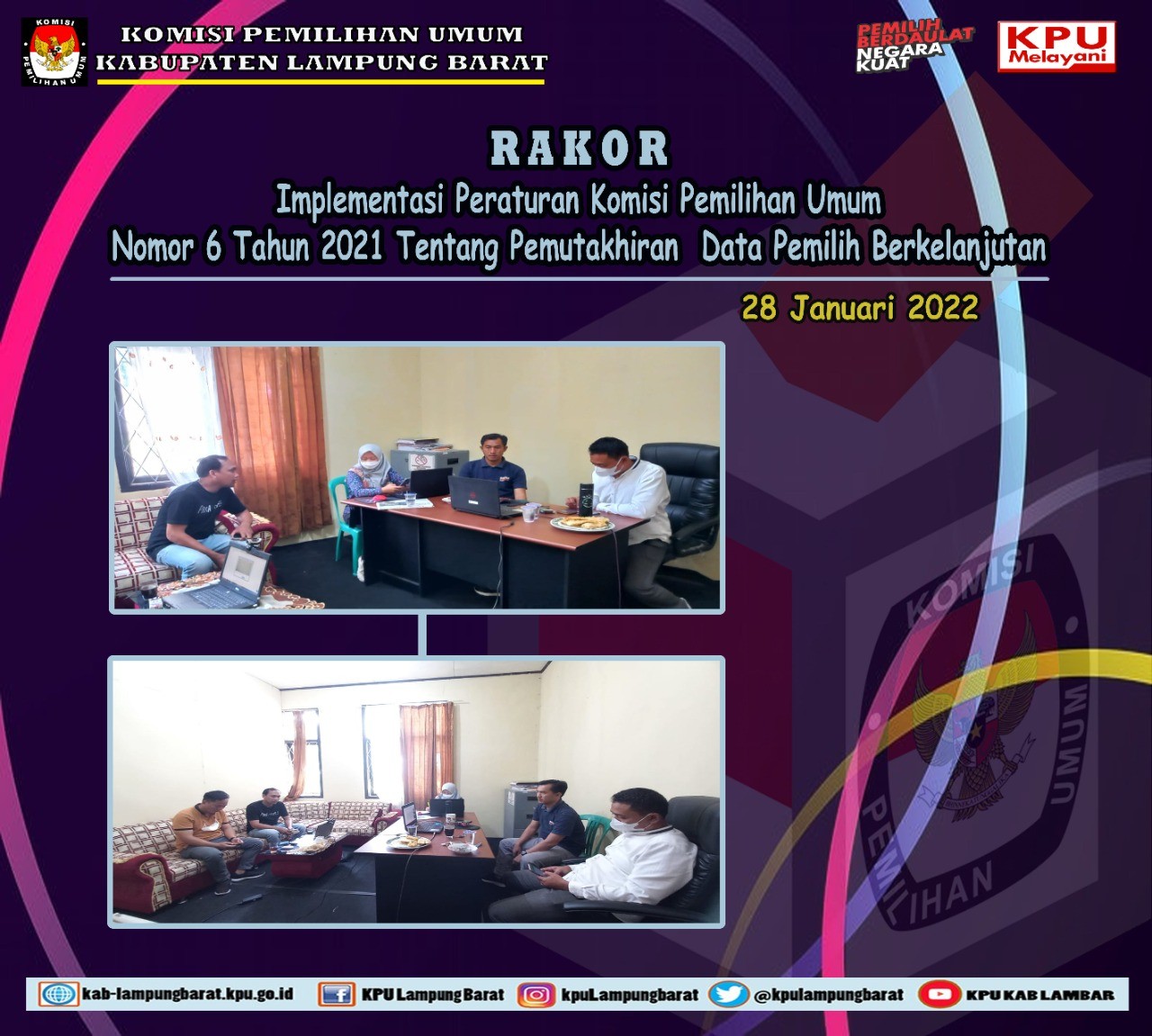 Komisi Pemilihan Umum Kabupaten Lampung Barat melaksanakan Bedah Regulasi pada hari Kamis tanggal 06 Januari 2022. Bertempat di Aula KPU Kabupaten Lampung Barat, agenda ini dihadiri oleh unsur pimpinan yaitu Bp. Arip Sah, S.Kom (Divisi Keuangan Umum dan Logistik), Bp. Surya Pirnata, S.Pd. (Divisi Hukum dan Pengawasan), serta Bp. Sarif Ediansyah, S.HI., M.M. (Divisi Teknis) secara langsung, dan Ibu Indah Dian Sari, S.HI., M.HI. (Divisi Sosdiklih Parmas dan SDM), serta Bp. Ahmad Soleh, S.H. (Divisi Program dan Data) yang terhubung dalam jaringan, beserta jajaran Sekretariat.