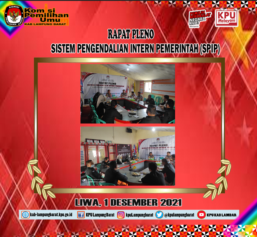 Komisi Pemilihan Umum Kabupaten Lampung Barat melaksanakan agenda rutin Rapat Pleno Sistem Pengendalian Intern Pemerintah (SPIP) pada hari Rabu tanggal 01 Desember 2021. Bertempat di Rumah Pintar Pemilu, agenda ini dihadiri langsung oleh 5 orang Komisioner yaitu Bp. Arip Sah, S.Kom (Divisi Keuangan Umum dan Logistik), Bp. Sarif Ediansyah, S.HI., M.M. (Divisi Teknis), Ibu Indah Dian Sari, S.HI., M.HI. (Divisi Sosdiklih Parmas dan SDM), Bp. Surya Pirnata, S.Pd. (Divisi Hukum dan Pengawasan), serta Bp. Ahmad Soleh, S.H. (Divisi Program dan Data). Agenda ini juga turut dihadiri oleh Sekretaris Komisi Pemilihan Umum Kabupaten Lampung Barat, Bp. Redy Kennedy, M.IP., serta Para Kasubbag.