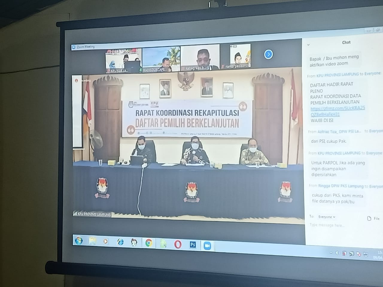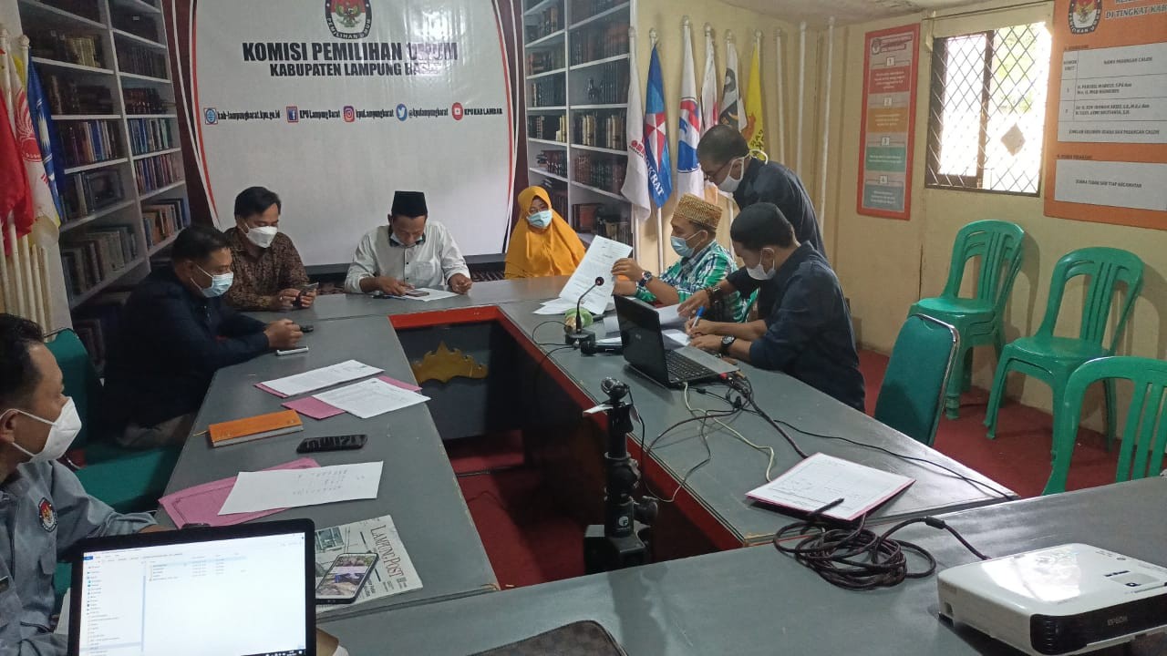 Kamis 6 Mei 2021 Komisi Pemilihan Umum Kabupaten Lampung Barat mengikuti rapat internal rekapitulasi daftar pemilih berkelanjutan periode April 2021 tingkat Provinsi Lampung via daring berdasarkan surat undangan KPU Provinsi Lampung Nomor : 147/PP.01.3-UND/18/Prov/IV/2021 tanggal 3 Mei 2021. Rapat internal rekapitulasi Daftar Pemilih Berkelanjutan periode April 2021 tingkat provinsi Lampung dipimpin oleh Agus Riyanto sebagai Ketua Datin mendampingi Ketua KPU Provinsi Lampung, rapat internal ini juga sebagai tindaklanjut daripada Surat Edaran KPU RI Nomor : 366/PP.02-SD/01/KPU/IV/2021 tanggal 21 April 2021 atas perubahan Surat Edaran KPU RI Nomor : 132/PP.02-SD/01/KPU/II/2021. KPU Provinsi Lampung melakukan rekapitulasi Daftar Pemilih Berkelanjutan berdasarkan pembacaan Hasil Rekapitulasi Daftar Pemilih Berkelanjutan periode April 2021 tingkat KPU Kabupaten/Kota se-Provinsi Lampung, dengan harapan adanya pemuktahiran daftar pemilih secara berkelanjutan ini, KPU Provinsi Lampung dan KPU Kabupaten/Kota dapat menyajikan data pemilih yang akurat pada Pemilu/Pemilukada dimasa yang akan datang"kata Agus Riyanto. KPU Kabupaten Lampung Barat dalam kesempatan ini membacakan hasil pemuktahiran periode April 2021 atau jumlah pemilih bulan berjalan sebanyak 215.799 pemilih, yang terdiri dari jumlah DPB sebelumnya 215.845 pemilih jumlah pemilih TMS 56, pemilih baru 10 yang tersebar di 15 Kecamatan" kata Ahmad Soleh selaku Ketua Datin KPU Lampung Barat. selanjutnya berdasarkan pembacaan Hasil Rekapatilusi Daftar Pemilih Berkelanjutan periode April 2021 yang di input dari 15 Kabupaten/Kota maka jumlah pemilih bulan berjalan tingkat KPU Provinsi Lampung sebanyak 5.972.307 pemilih" kata Agus Riyanto mengakhiri rapat hari ini. Berikut Capture Kegiatan Tersebut :