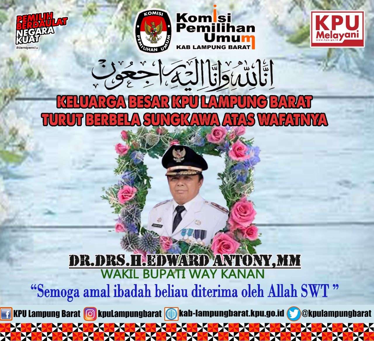 pengabdiannya setelah kurang lebih 35 tahun menjadi abdi negara terhitung sejak di angkat menjadi Pegawai Negeri Sipil pada Maret tahun 1985 silam. Yang Cukup Istimewa dan menjadi cacatan sejarah tersendiri Bagi KPU Lampung Barat, yaitu dari 35 tahun mengabdi sebagai ASN dan tercatat tidak kurang dari 28 Tahun tercatat saat menyambut pemilu 1992 yang saat itu urusan pemilihan di tingkat kabupaten di tekuni oleh bagian sosial politik ( Sospol) hingga memasuki masa pensiun pada 10 Agustus 2020, beliau mengabdikan diri di lembaga penyelenggara pemilu.