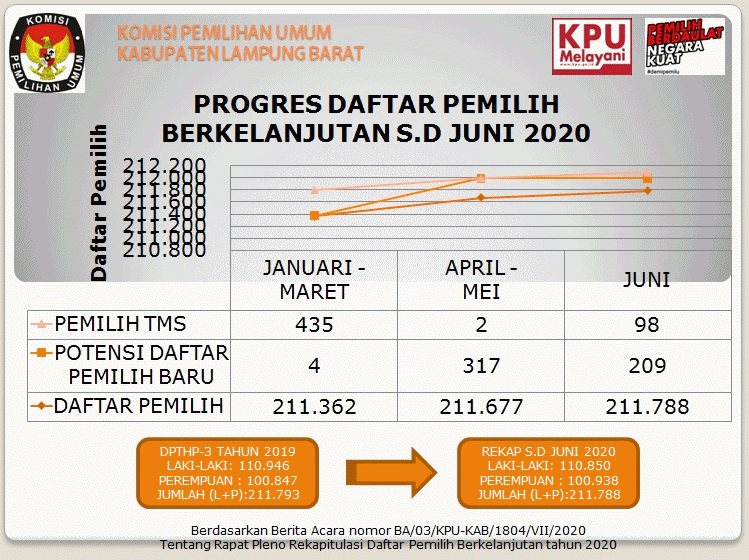 Sementara menurut Ketua divisi data, Ahmad soleh berdasarkan hasil pleno rekapitulasi daptar pemilih berkelanjutan periode juni 2020, diketahui total jumlah pemilih Lampung Barat hingga bulan juni 2020 sebanyak 211.788 terdiri dari Laki-laki 110.850 dan perempuan sebanyak 100.938 yang tersebar di 15 kecamatan pada 136 desa dan keluarahan. Jumlah tersebut mengalami penambahan potensi pemilih baru mencapai 111 pemilih dari hasil pleno rekapitulasi periode Mei 2020.
