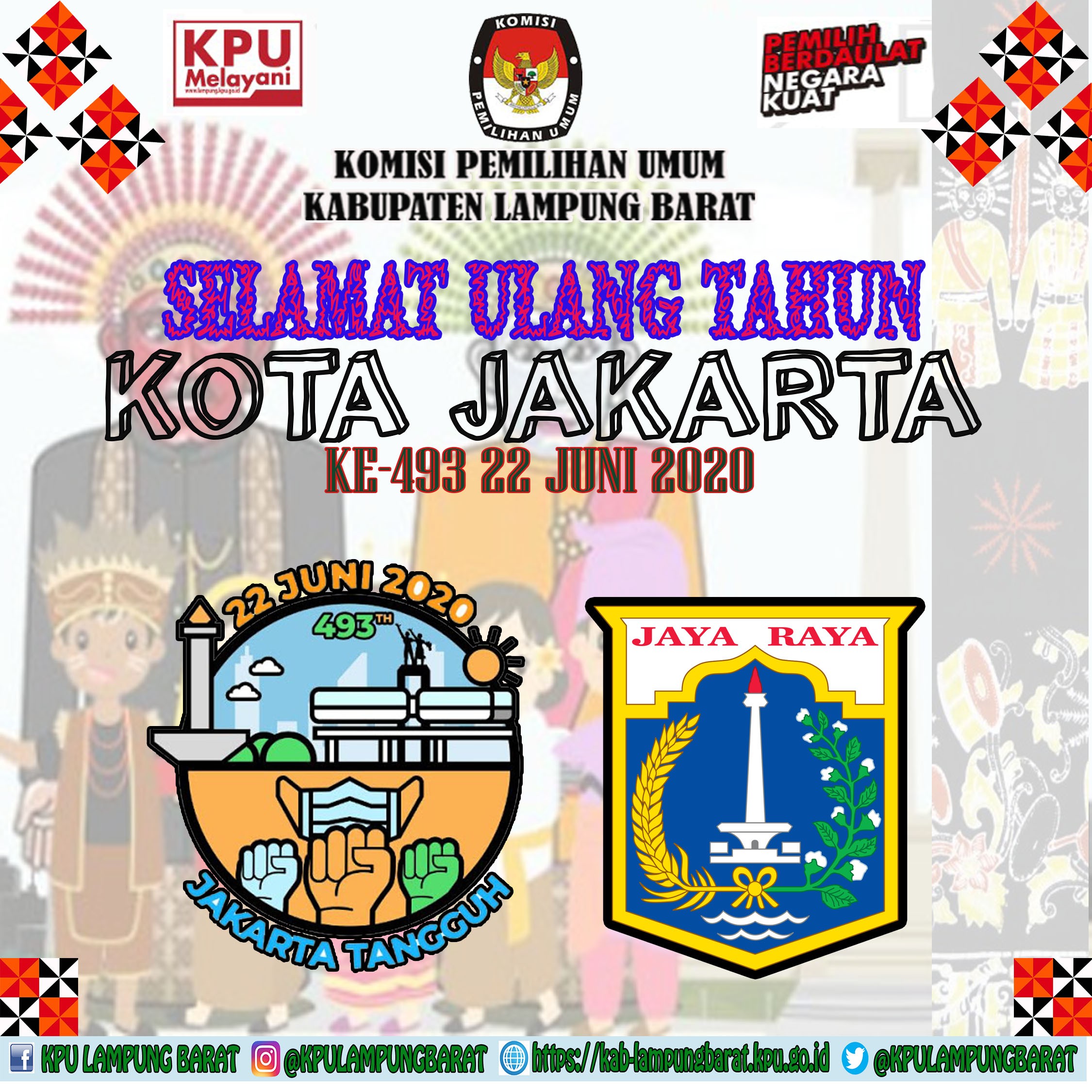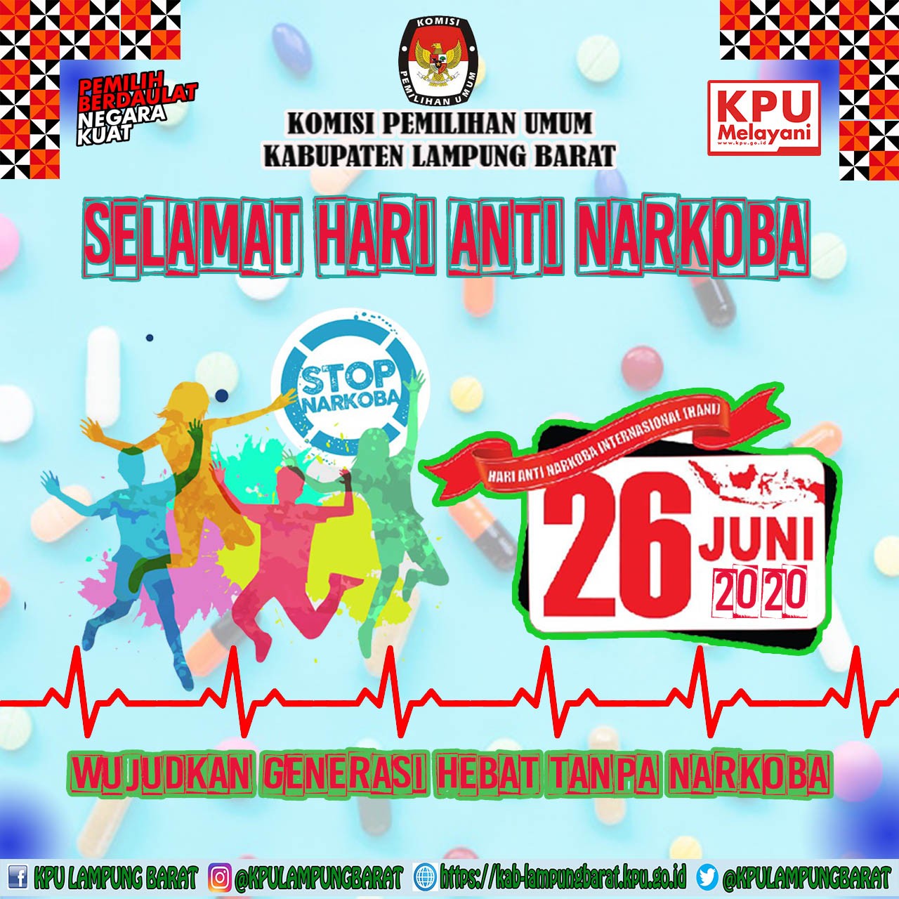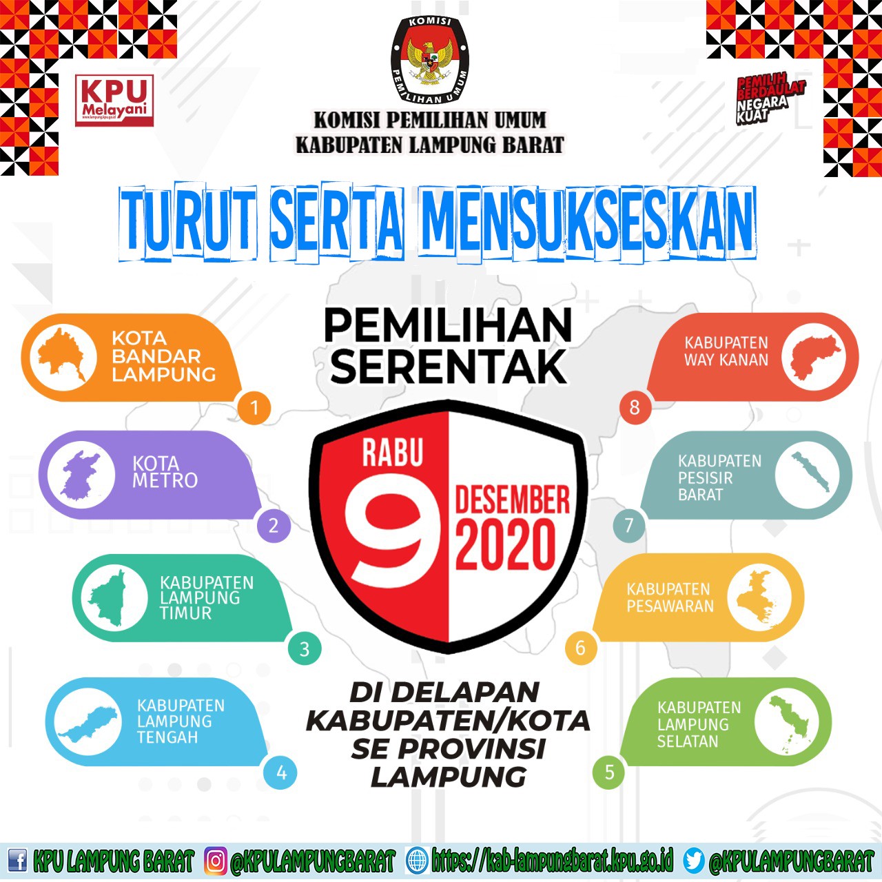 Komisi Pemilihan Umum Kabupaten Lampung Barat GEMA PILKADA NEW NORMAL Begitulah Slogan KPU Lambar pada Pemilu Serentak di 8 Kabupaten/Kota Seprovinsi Lampung , Meski tidak Menyelenggarakan Pilkada Serentak tahun 2020 ini, dalam diskusi harian di sela-sela melaksanakan tugas KPU Lampung Barat Beserta Kesekretariatan KPU Lampung Barat terus membahas mengenai Pilkada 2020, karena Gemanya yang juga sampai Lampung Barat, maka KPU Lampung Barat Wajib menggemakan Kembali di Wilayah Lampung Barat karena tidak menutup kemungkinan bahwa terdapat warga Lampung Barat yang berasal dari Luar lampung Barat atau dari 8 Kabupaten/Kota yang melaksanakan Pilkada 2020 yang sifatnya Merantau Mingguan/Bulanan saja, sehingga Warga tersebut mengetahui dan selalu ingat bahwa daerahnya sedang Pilkada, sehingga Warga tersebut dapat merancang di hari Rabu, 9 Desember 2020 tersebut atau Hari pemungutan suara bisa Pulang dengan Alasan Memberikan Hak Suaranya sekaligus Berlibur bertemu Keluarga di rumah setelah sekian lama merantau ke Lampung Barat.