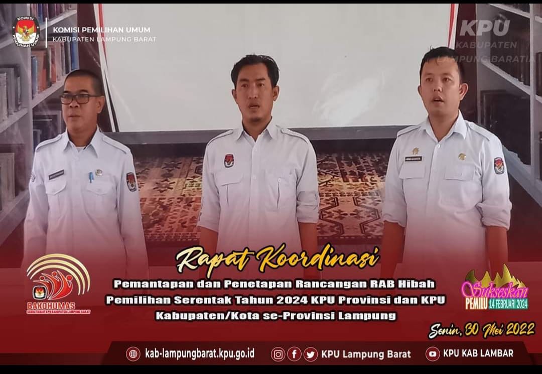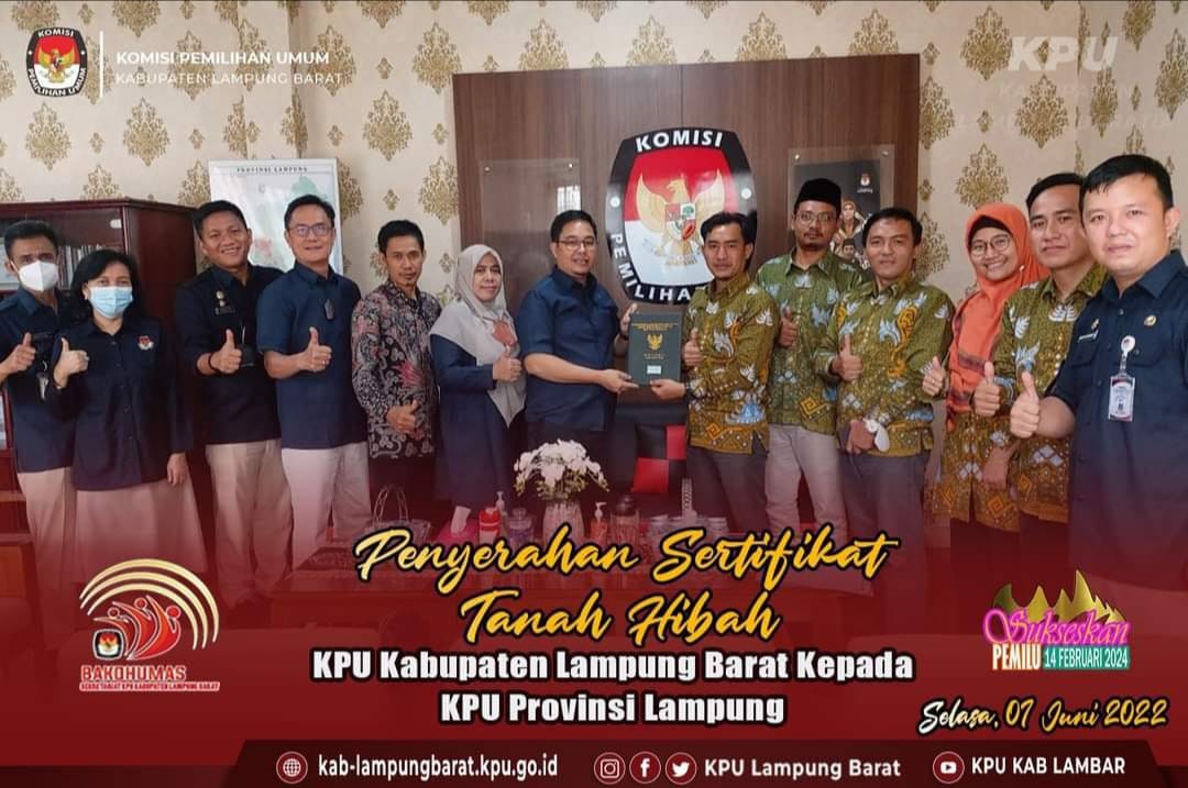 Selasa, 07 Juni 2022 KPU Kabupaten Lampung Barat Menyerahkan Sertifikat Tanah Hibah an. Komisi Pemilihan Umum Republik Indonesia ke KPU Provinsi Lampung. Penyerahan Sertifikat Tanah Hibah diberikan Oleh Ketua KPU Lampung Barat Arip Sah dan diterima oleh Ketua KPU Provinsi Lampung Erwan Bustami, serta disaksikan Oleh Anggota KPU Provinsi Lampung M. Tio Aliansyah, Antoniyus, dan Titik Sutriningsih, Sekretaris Provinsi Lampung Mashur Sampurna Jaya, Kabag KUL MM Reni Lestiani, Kasubbag Umum Jumadi Ahmad, Anggota KPU Lampung Barat, Sarif Ediansah, Ahmad Soleh, Surya Pirnata, Indah Dian Sari, dan Sekretaris KPU Lampung Barat Redy Kennedy.