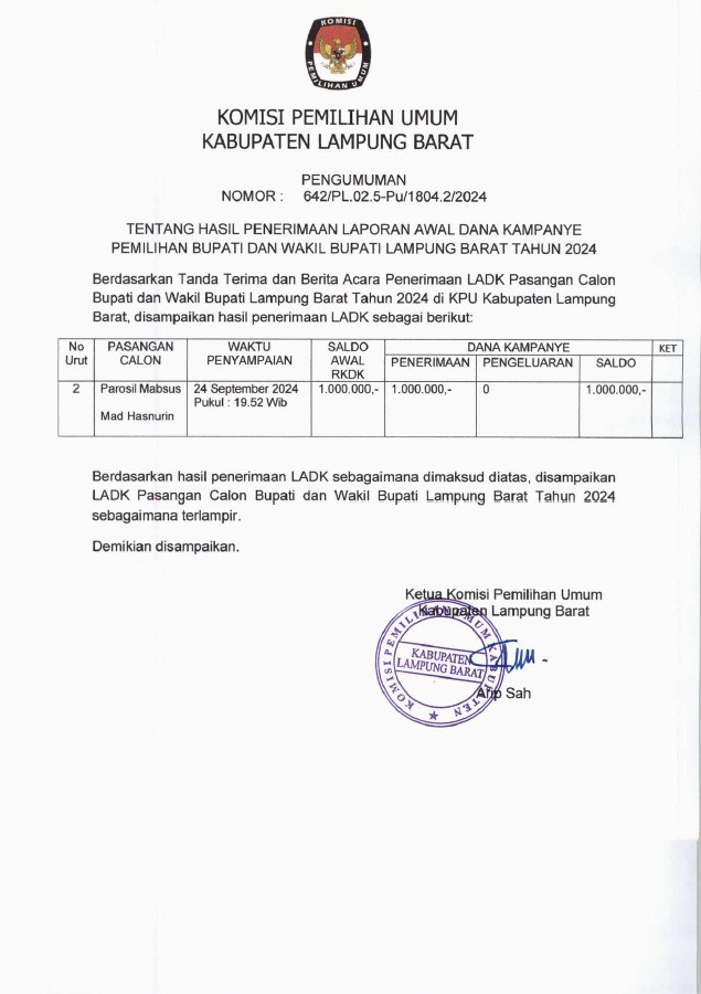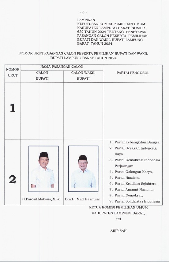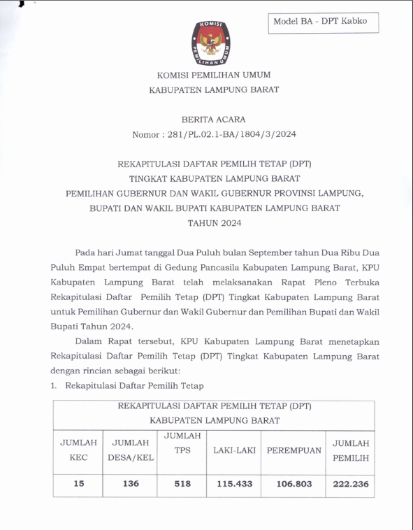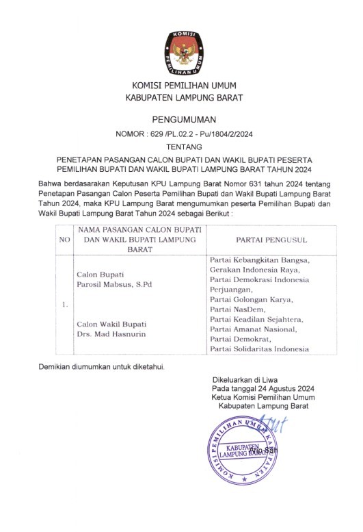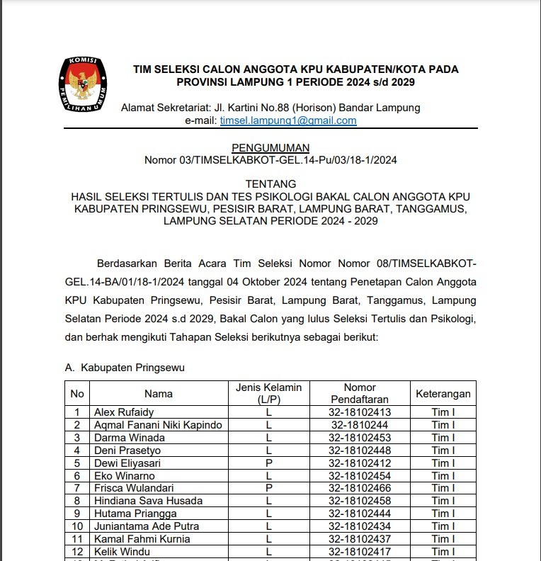 Berikut disampaikan tautan Pengumuman Hasil Seleksi Tertulis dan Test Psikologi Bakal Calon Anggota KPU Kabupaten Pringsewu, Pesisir Barat, Lampung Barat, Tanggamus, dan Lampung Selatan Periode 2024 - 2029,