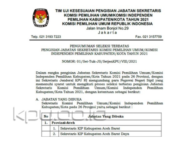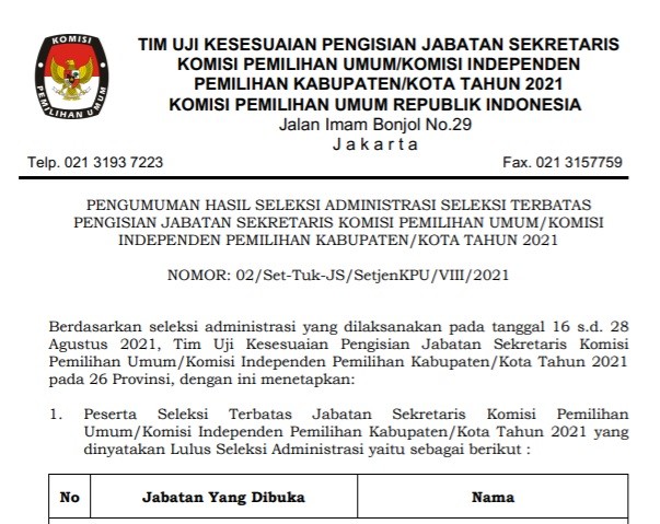 Jakarta, kpu.go.id - Berdasarkan hasil Seleksi Penerimaan Mahasiswa Baru di Universitas serta Seleksi Wawancara yang dilakukan oleh Komisi Pemilihan Umum (KPU) Republik Indonesia terhadap para calon penerima Beasiswa Pendidikan Tinggi Program Magister Konsentrasi Tata Kelola Pemiihan Umum, Sekjen KPU RI menerbitkan Pengumuman Nomor 7/SDM.03.1-Pu/05/SJ/VIII/2021 Tentang Nama-Nama Penerima Beasiswa Pendidikan Tinggi Program Magister Konsentrasi Tata Kelola Pemilihan Umum Batch VII Gelombang KetugaTahun 2021.